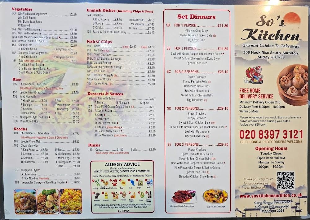 Located at 309 Hook Rise S, Chessington, Surbiton KT6 7LS, So's Kitchen is perfectly situated for anyone craving authentic Chinese food in the area. The restaurant proudly offers an open kitchen where you can watch talented chefs at work, enhancing the dining experience. This venue accommodates diners looking for a casual meal or a quick bite by providing delivery, takeaway, and dine-in options. Reservations are available to ensure you secure your spot, and customer service is consistently commendable, with staff often praised for their politeness and efficiency.